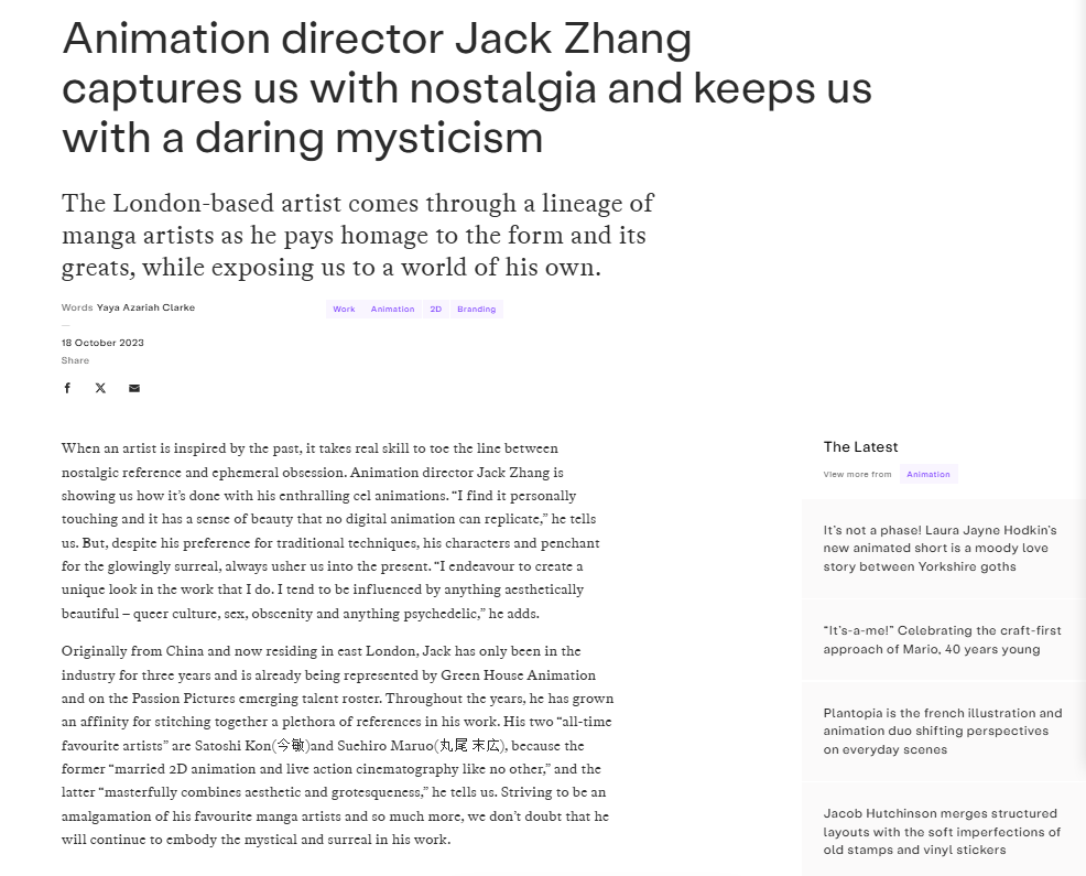 倫敦的動畫導演張杰以其傳統的手繪動畫風格以及濃厚的懷舊氛圍,吸引了無數觀眾的目光。他的作品不僅深受日本漫畫文化的影響,同時又展示了他獨特的藝術視角和對當代藝術的大膽探索。張杰的作品不只是對過去的致敬,更是通過將傳統技巧與超現實、迷幻的元素相結合,帶領觀眾走進一個既熟悉又陌生的世界。